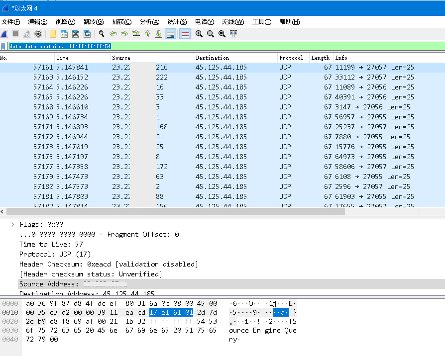 以服务端收到的数据包为例,攻击流量中会有大量源IP(攻击者控制的肉鸡主机)伪装成正常连接,而且通常来源也被进行了伪造,又因为可能来自任何区域,故无法在不误杀正常玩家溯源封堵。并且攻击流量原先为固定源端口,但在攻击者发现我们采取了措施后,在3月19日新一轮攻击时,进一步的源端口也会随机变化目的在于伪装成正常客户端的连接情形下会使用的随机高端口,并且呈现自动化的攻击趋势,在服务器人数达到一定阈值时自动发起攻击流量。